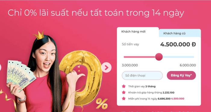 Ra mắt lần đầu vào năm 2014, ứng dụng Momo đã trở thành ví điện tử nổi tiếng, thu hút hơn 50 triệu người dùng sau 10 năm hoạt động. Hiện tại, Momo cũng được xem là ứng dụng vay tiền nhanh đáng tin cậy với hạn mức trả góp từ 1.000.000 đồng đến 20.000.000 đồng. Mức lãi suất trả góp là 0%, giúp bạn yên tâm khi vay. Tuy nhiên, nếu quá hạn trên 14 ngày, bạn sẽ phải trả thêm phí trễ hạn tối đa 20% tổng số tiền vay ban đầu.