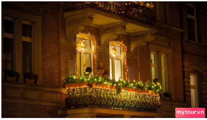 Trang trí Giáng sinh ngoài trời với dây bóng đèn tạo không khí lễ hội, làm nổi bật chi tiết trang trí từ cổ điển đến hiện đại. Dây đèn đa dạng kích thước và màu sắc tạo nên không gian phát sáng và độc đáo.