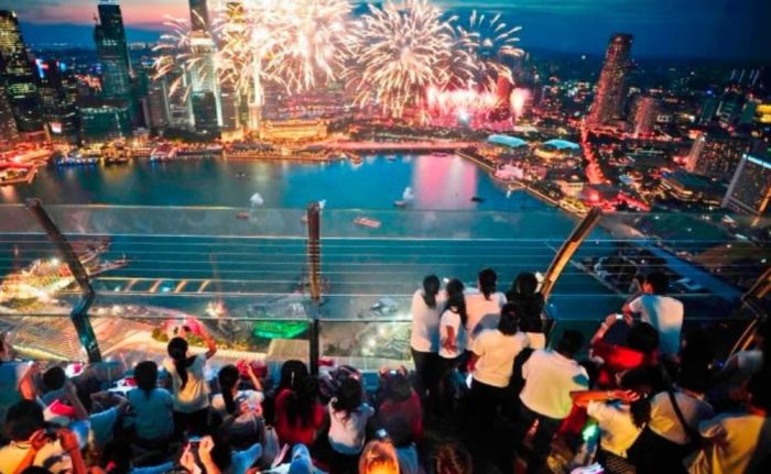 Ở độ cao 200 mét so với mặt đất, đài quan sát Marina Bay Sands Skypark là nơi bạn chiêm ngưỡng toàn cảnh Singapore hiện đại và rực rỡ nhất. Đây là điểm tuyệt vời để ngắm pháo hoa và nhìn toàn bộ vịnh Marina bên dưới. Đừng bỏ lỡ màn trình diễn pháo hoa rực rỡ tại vịnh Marina ở Singapore.