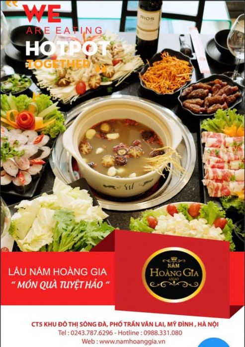 Tại Lẩu Nấm Hoàng Gia, bạn sẽ thưởng thức lẩu nấm độc đáo, cung cấp dưỡng chất cho bữa ăn. Canh bổ dưỡng ninh từ xương lợn, gà và thảo dược như sâm, kỳ tử, táo đỏ, tỏi, cùng nấm quý như bụng dê, kê tùng, vuốt hổ đen, gan bò vàng tạo nên hương vị thơm ngọt mát, đậm đà. Lẩu kết hợp với thịt bò Úc, chim câu, gà ác, ba ba, cá chình, sâm cầm theo khẩu vị của bạn. Lẩu nấm không chỉ ngon miệng mà còn giàu dưỡng chất, vitamin và khoáng chất. Thực phẩm tự nhiên 100%. Nhà hàng còn phục vụ nhiều món hấp dẫn như cá hồi Nauy cuốn lá rong biển, chân gà hoàng gia, sườn bò Mỹ nướng, chim câu quay...