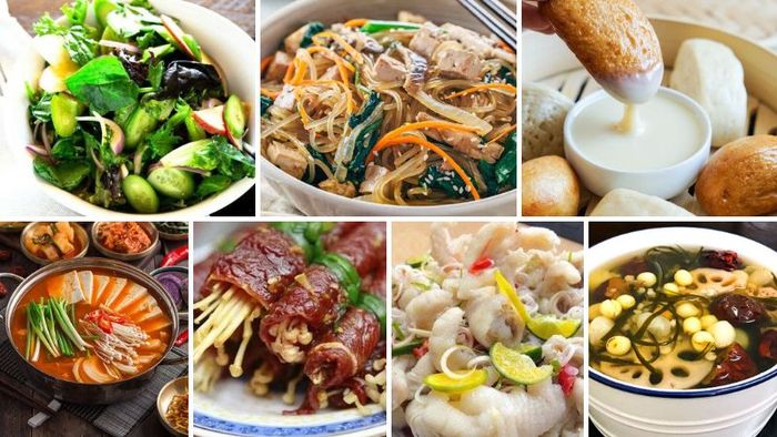 Khai vị: Salad rau xanh Hàn Quốc, Mì xào, Bánh mì chấm sữa.