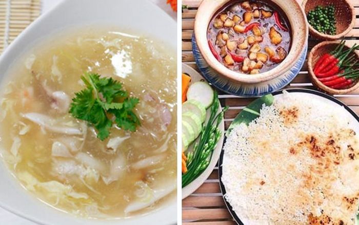Để khởi đầu cho một buổi tiệc tất niên tại nhà, một tô súp nấm tuyết là lựa chọn hoàn hảo. Nước súp được nêm nếm vừa ăn, độ sệt vừa phải, với những lát nấm tuyết dai, giòn tạo thêm sự hứng thú. Tiếp theo là món cơm cháy kho quẹt, dù đơn giản nhưng vô cùng ngon miệng, khiến cho thực khách cảm thấy thú vị.