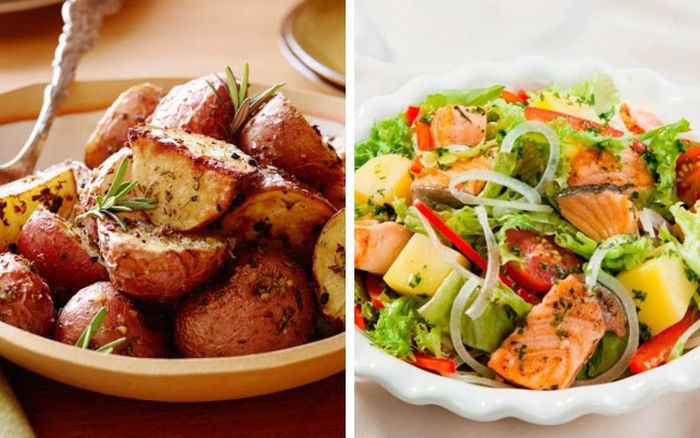 Một đĩa salad cá hồi với thịt cá hồi tươi, béo ăn chung với các loại rau củ tự nhiên sẽ giúp người ăn cảm thấy nhẹ nhàng và tránh nặng bụng lúc bắt đầu bữa tiệc. Kế đến là món khoai tây nướng bỏ lò được tẩm ướp thiên vị ngọt, khoai tây nướng chín đều, vàng ươm và vô cùng giòn sẽ khiến người ăn thích thú.