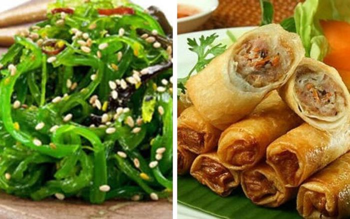 Một món ăn nhẹ nhàng, tươi mát như salad rong biển rất thích hợp cho một món khai vị. Rong biển giòn, tươi và ngọt ăn chung với nước sốt mè rang càng giúp tăng thêm hương vị món ăn. Tiếp đến là những cuốn chả giò được chiên vàng ươm, ăn kèm với nước mắm chua ngọt sẽ kích thích được vị giác của bạn.