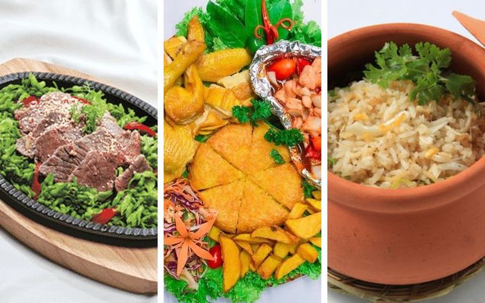 Cơm chiên hải sản với cơm được chiên chín vàng, tơi xốp và không quá khô, kết hợp với các topping hải sản sẽ làm cho món ăn thêm phong phú. Gà hấp lá chanh sẽ mang đến những miếng thịt gà mềm mịn, chắc thịt, kèm theo nước chấm sẽ làm cho món ăn thêm hấp dẫn. Cuối cùng, một con cá diêu hồng mắm xoài chua chua, ngọt ngọt với thịt cá được chế biến kỹ lưỡng, thịt ngọt sẽ giúp bạn no căng bụng.
