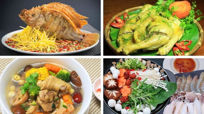Món chính: Cá diêu hồng mắm xoài, Gà hấp lá chanh, Gà hầm rau củ, lẩu Hải sảnTráng miệng: Chè khúc bạch