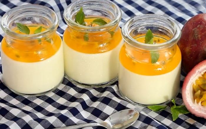 Một món tráng miệng quen thuộc cho các bạn chính là món Panna cotta ăn chung với nước sốt chanh dây, vừa chua chưa, béo béo nhưng vẫn có vị ngọt đặc trưng từ sữa, giúp cho bữa tiệc thêm ngon miệng.