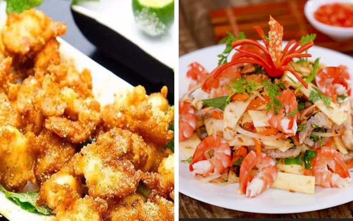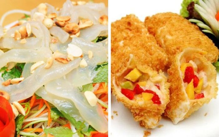 Gỏi sứa tôm thịt với phần sứa được chế biến kỹ lưỡng, thịt giòn ngọt phối hợp cùng tôm và nước sốt là một lựa chọn khai vị tuyệt vời. Bên cạnh đó, món chả giò chiên trái cây có hương vị ngọt ngào và giòn rụm từ lớp bánh tráng bên ngoài sẽ làm hài lòng thực khách.