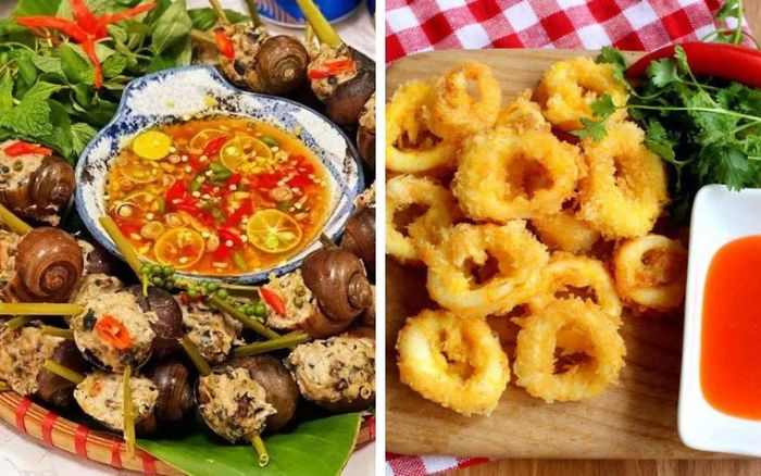 Khai vị: Ốc bươu nhồi thịt, Mực tẩm bột chiên giòn