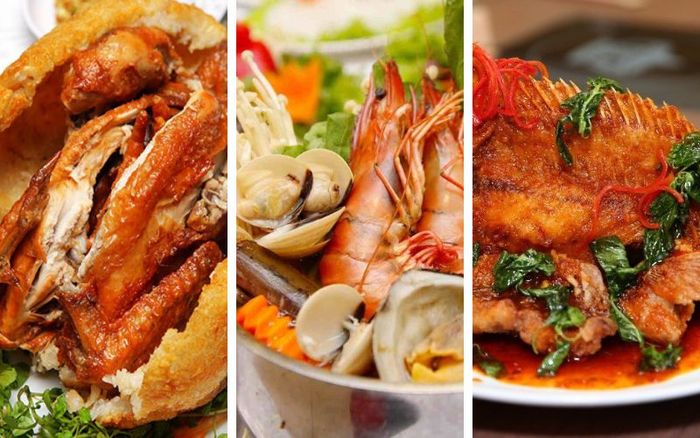 Khai vị: Ốc bươu nhồi thịt, Mực tẩm bột chiên giònMón chính: Gà bó xôi chiên giòn, Cá chẽm sốt chua ngọt, Lẩu hải sản