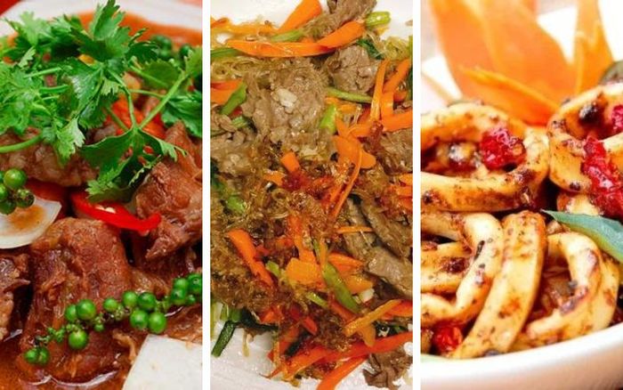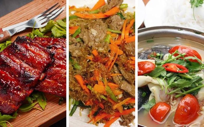 Khai vị: Gỏi bò bóp thấu, Tôm cuốn bánh mì sandwichMón chính: Sườn nướng mật ong, Miến xào bò, Lẩu cá lăng măng chua