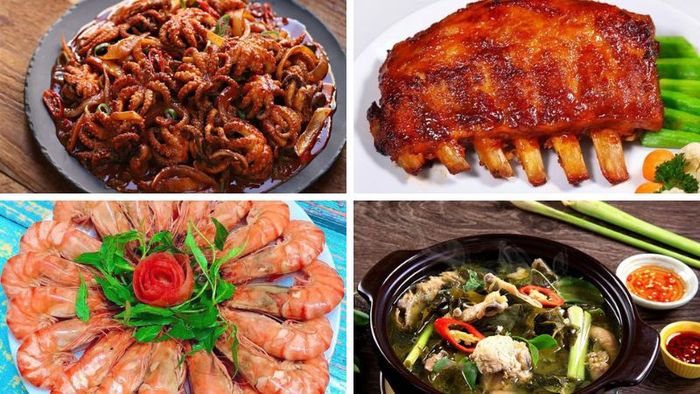Khai vị: Súp cuaMón chính: Bạch tuộc xào cay, Sườn nướng BBQ, Tôm hấp nước dừa, Lẩu gà lá giang