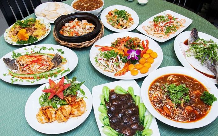 Khai vị: Gỏi ngó sen, bánh phồng tômMón chính: Cá diêu hồng mắm xoài, Gà hấp lá chanh, Gà hầm rau củ, lẩu Hải sản