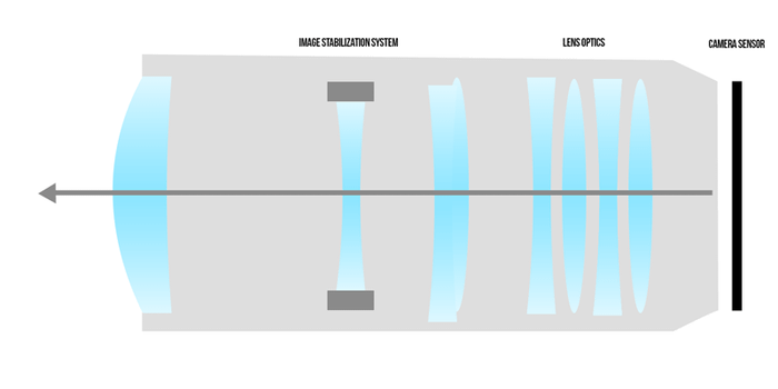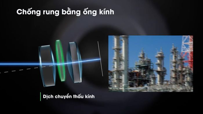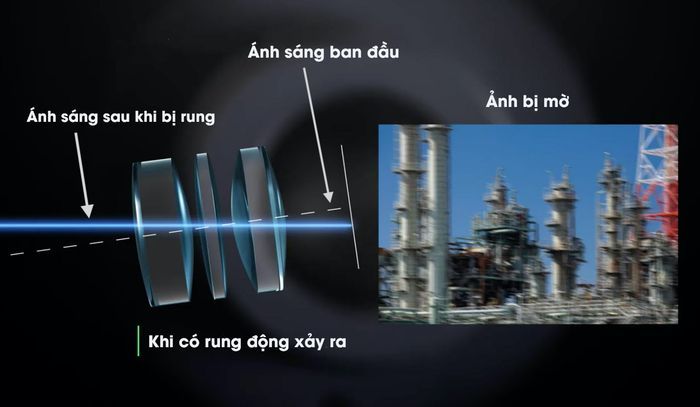 Trong cấu trúc của ống kính máy ảnh, thực ra là một chuỗi các thấu kính được sắp xếp theo một trình tự cụ thể. Ánh sáng sẽ đi qua tất cả các thấu kính này trước khi đến cảm biến để tạo ra hình ảnh và được cảm biến ghi lại, sau đó chuyển đổi thành tấm ảnh mà bạn có thể xem được. Trong công nghệ giảm rung bằng ống kính, có một hoặc nhiều thấu kính có khả năng di chuyển so với trục chính của chúng. Như bạn có thể thấy trong hình dưới đây, khi máy ảnh phát hiện rung, nó sẽ tự động tính toán khoảng cách lệch so với vị trí ban đầu và di chuyển thấu kính để điều chỉnh lại tia sáng để phù hợp với vị trí ban đầu, như vậy hình ảnh sẽ không bị mờ đi. Đây là một biện pháp để 'bù' lại chuyển động của bạn.