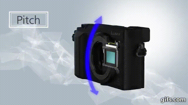 Cách hoạt động của hệ thống giảm rung quang học bằng cách di chuyển cảm biến cũng tương tự như trên, nhưng thay vì di chuyển thấu kính, máy sẽ di chuyển cảm biến lên xuống (và ở một số dòng là di chuyển cả trái phải) để điều chỉnh hướng ánh sáng. Như hình bên dưới, cảm biến có thể di chuyển theo chiều ngang, dọc và cả quay (pitch).
