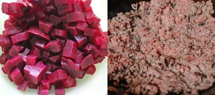 Bước 1: Bắt đầu với việc làm sạch thịt bò và băm nhuyễn. Củ dền và khoai tây được gọt vỏ sạch, rồi thái nhỏ.