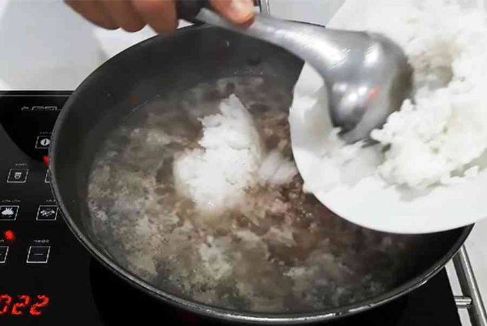 Bước 3: Gạo sạch được vo và đưa vào nồi để nấu cháo. Khi cháo mềm và hạt gạo đã nở, thêm thịt bò, khoai tây và củ dền vào ninh cùng. Sau khoảng 10 phút, khi cháo đã nhừ và các nguyên liệu chín, thêm gia vị và tắt bếp.