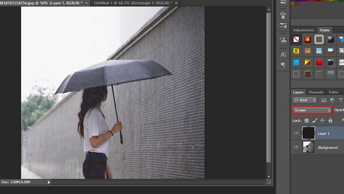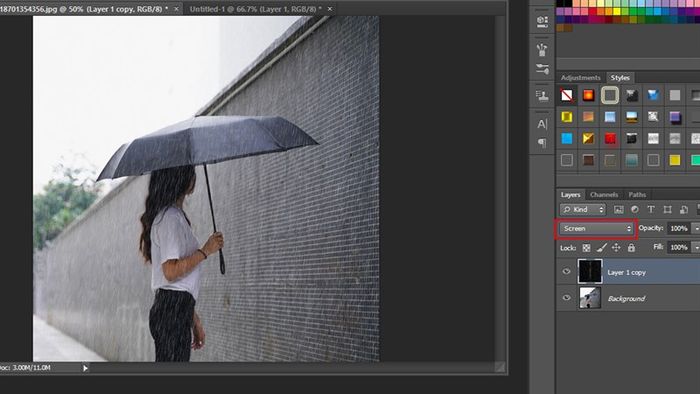Bước 4: Tiếp theo, điều chỉnh chế độ hòa trộn của lớp mưa từ Normal sang Screen, có thể điều chỉnh thêm Opacity để hiệu ứng trở nên thực tế hơn.