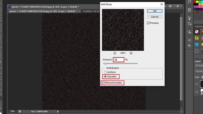 Bước 6: Mở cửa sổ Thêm Nhiễu, điều chỉnh Khối lượng khoảng từ 25% đến 30%, sau đó chọn Gaussian và Monochromatic. Nhấn OK để hoàn tất.