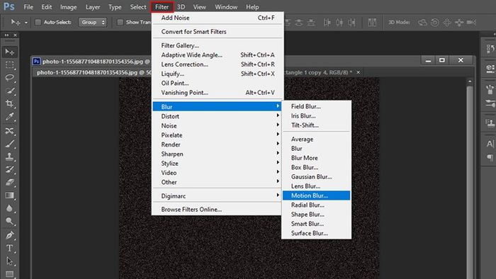 Bước 7: Đến bước này, Noise vẫn chưa giống với hình dạng của mưa lắm. Đừng lo, tiếp tục vào menu Lọc > Mờ > Mờ Chuyển Động.