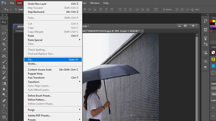 Bước 3: Sau đó, vào Chỉnh sửa > Điền hoặc nhấn tổ hợp phím tắt Shift + F5 trên bàn phím để mở hộp thoại Điền.