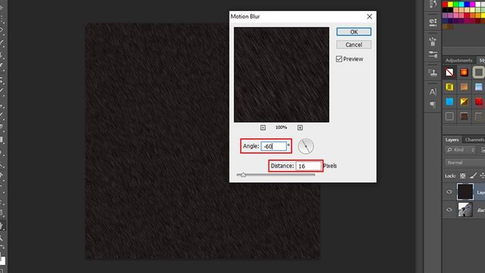 Bước 8: Sau khi cửa sổ Mờ Chuyển Động hiện lên, điều chỉnh góc nghiêng của các hạt Noise để tạo hình dạng giống mưa thật với các thông số sau: