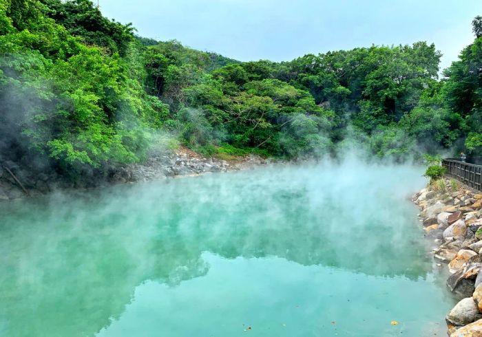 Khi đến gần Beitou Sulphur, bạn sẽ thấy những cột khói mảnh bốc lên từ mặt hồ màu xanh ngọc, tạo nên bức tranh tiên cảnh tuyệt vời. Nhờ vào những khoáng chất trong nước suối, thảm thực vật xung quanh trở nên rực rỡ hơn. Nơi này còn cung cấp trải nghiệm leo núi đá mạo hiểm hấp dẫn đối với các bạn trẻ.
