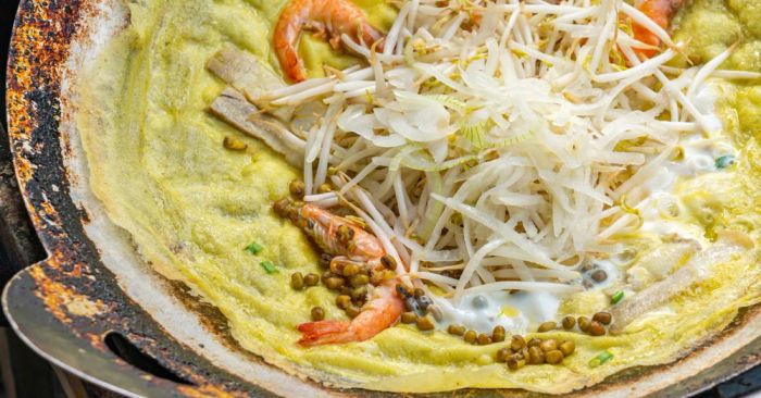 Bánh xèo Cà Mau lớn hơn vàng ươm từ bột gạo, nước cốt dừa và nghệ. Nhân gồm tôm, thịt heo, giá đỗ và rau sống, mang hương vị đặc trưng Cà Mau. Hòa quyện vị giòn, ngọt và hương bùi tuyệt vời khi thưởng thức.
