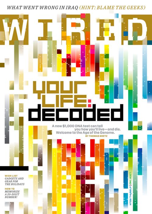 Một tháng sau đó, Scott Dadich và tôi đang trình bày các ý tưởng cho bìa kế tiếp về kiểm tra DNA, và tất cả những gì tôi có thể nhớ là các ý tưởng thất bại, các ý tưởng chết đi, các ý tưởng bị giết tàn nhẫn vào cuối ngày. Trước khi tôi biết đến, chúng tôi đã hết ý tưởng và gần như hết thời gian. Khi đêm đến mang theo sự tuyệt vọng, chúng tôi mở một chai Maker's Mark, mở máy tính và bắt đầu tự do sáng tác. Làm thế nào MYTOUR hình dung một khái niệm độc đáo và đổi mới như vậy? Câu trả lời: không có họa sĩ minh họa, không có nhiếp ảnh gia, không có kiểu chữ đặc biệt. Chỉ có hai nhà thiết kế đang làm điên đảo và một chai bourbon. Tôi chưa bao giờ cảm thấy là một phần của Wired hơn. Tôi về nhà với suy nghĩ, 'Tôi đã đưa ra quyết định tốt nhất khi nhận công việc này.' Kiểm tra phần công nhận trang bìa.*” —Wyatt Mitchell, khi đó là giám đốc thiết kế