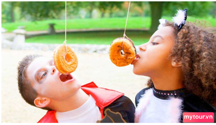 Cuộc đua ăn bánh Donut là một trò chơi Halloween vui nhộn, phù hợp cho cả trẻ em và người lớn. Trong trò chơi này, người chơi sẽ tham gia vào cuộc đua để xem ai có thể ăn nhanh và nhiều hơn những chiếc bánh Donut ngon lành.