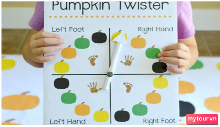 Tiếp theo, hãy chia bàn quay thành 4 phần tương ứng với hai tay trái phải và 2 chân, mỗi phần được sơn màu bí ngô khác nhau. Khi mũi tên chỉ vào một vị trí nào đó, các bé sẽ đặt một bộ phận của cơ thể vào màu tương tự trên sàn.