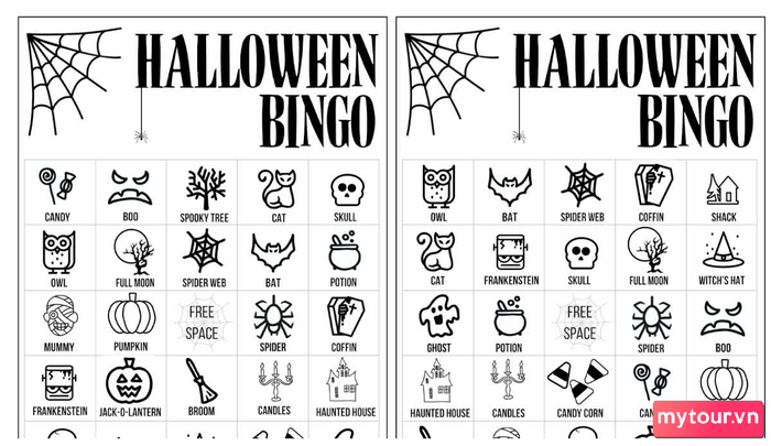 Halloween Bingo là một trò chơi chơi xổ số tô vô cùng thú vị dành cho trẻ em trong mùa lễ hội Halloween. Thay vì sử dụng các số, các bé sẽ sử dụng thẻ bingo với các biểu tượng Halloween như quả bí ngô, ma quỷ, ngôi nhà ma ám, mặt trăng lưỡi hái và nhiều hình ảnh khác.