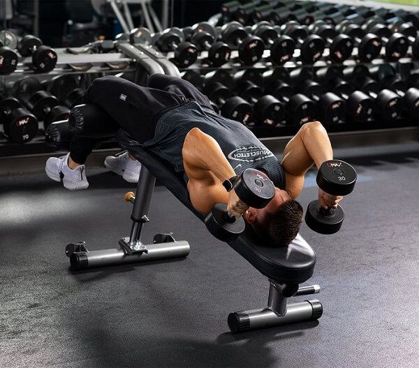 - Giữ chân chặt ở cuối ghế dốc, nằm xuống với mỗi tay cầm một tạ dumbbell. Lòng bàn tay hướng về nhau.