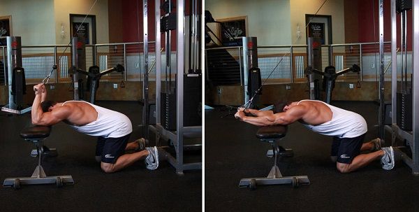 - Đặt đầu và cánh tay lên ghế. Khuỷu tay uốn cong, cẳng tay hướng về máy kéo cáp - đây là tư thế khởi đầu.