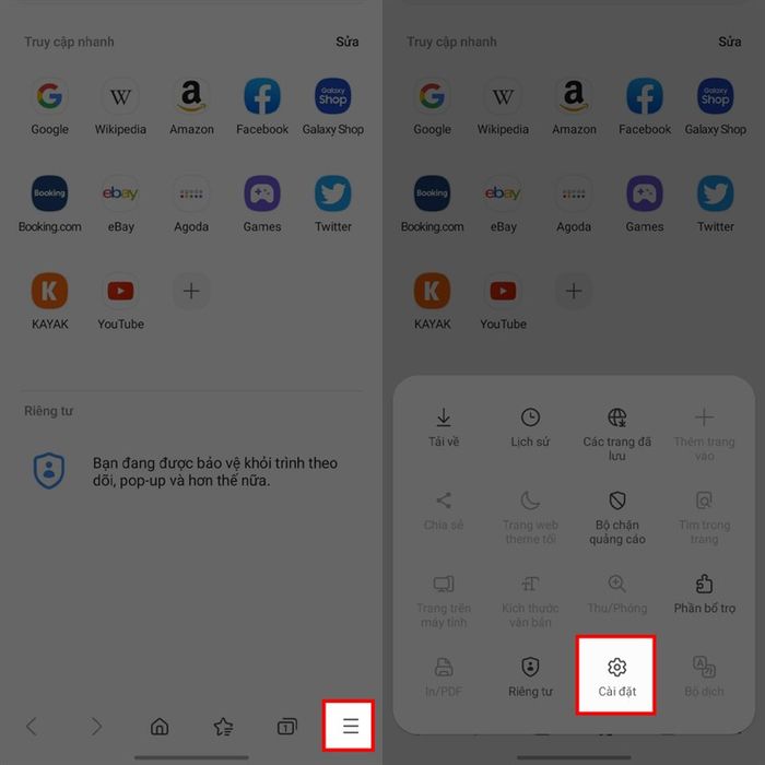 Bước 1: Sử dụng trình duyệt web sẽ tạo ra một lượng lớn bộ nhớ cache. Nếu bạn thường xuyên sử dụng trình duyệt Samsung Internet, hãy mở trình duyệt và chọn biểu tượng menu 3 gạch ngang ở góc dưới bên phải màn hình > chọn Cài đặt.