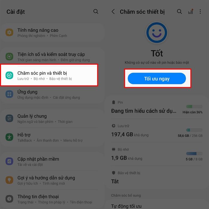 Một cách nhanh chóng để tối ưu hóa điện thoại và loại bỏ bộ nhớ đệm của các ứng dụng là sử dụng trình quản lý thiết bị. Chức năng này có sẵn trong điện thoại của bạn. Truy cập vào Cài đặt > Chăm sóc thiết bị và pin > nhấn Tối ưu ngay và để điện thoại tự làm phần còn lại. Nó sẽ tự động tối ưu hóa tất cả các thành phần trong điện thoại, bao gồm cả bộ nhớ, mang lại cho bạn trải nghiệm mượt mà hơn.