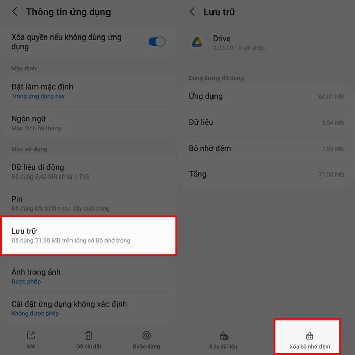 Bước 2: Tại đây, bạn kéo xuống phía dưới, tìm và chọn mục Bộ nhớ. Tất cả thông tin lưu trữ sẽ hiển thị, kể cả bộ nhớ đệm. Bấm vào Xóa cache để tiếnhành xóa theo ý muốn của bạn.