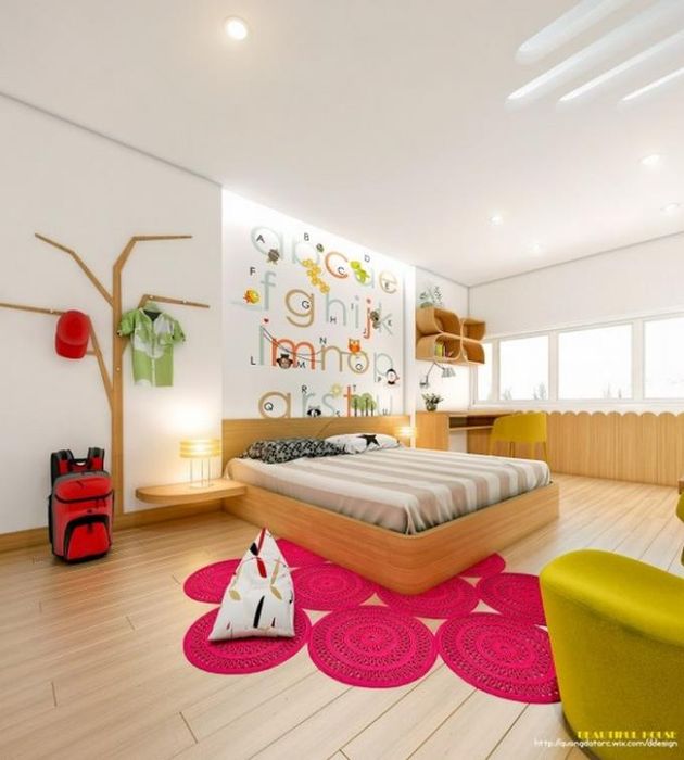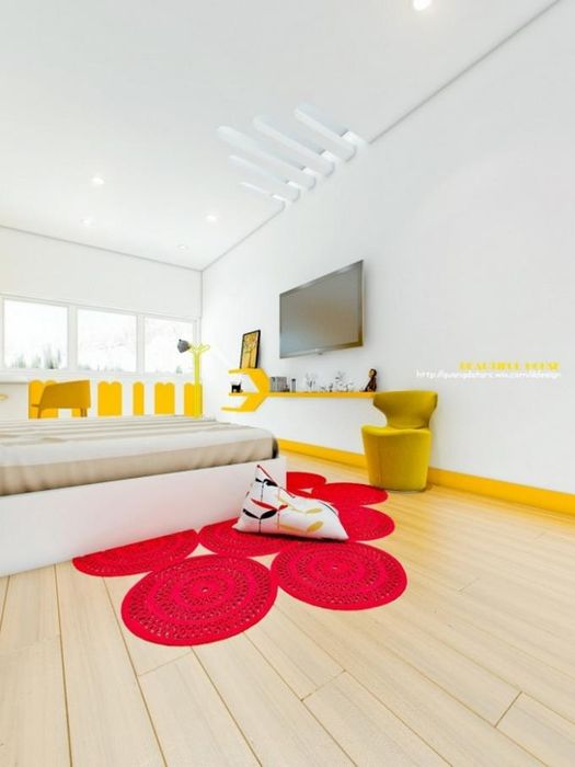 Một ví dụ khác minh chứng cho sức hút của gam màu vàng trong việc tạo nên sự sôi động cho không gian, đến từ thiết kế của DT Architects. Căn phòng này dành cho lứa tuổi nhỏ hơn so với phòng ngủ trước, với trang trí ngộ nghĩnh tập trung vào phần tường trống gần giường. Màu sơn, cửa và các vật dụng khác đều chìm trong sắc trắng, tôn lên vẻ đẹp của gam màu vàng chanh.