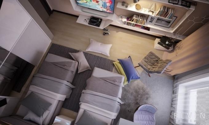 Căn phòng chỉ khoảng 15m² nhưng là không gian chung của hai người. Do đó, gam màu và nội thất được chọn với tông màu trung tính để dễ dàng phối hợp. Hai chiếc giường nhỏ đặt song song tạo cảm giác thoải mái cho việc nghỉ ngơi, trong khi góc bàn học nhỏ nhắn vẫn đáp ứng nhu cầu học tập. Kệ sách xung quanh TV là nơi teen có thể trưng bày những đồ vật yêu thích của mình.