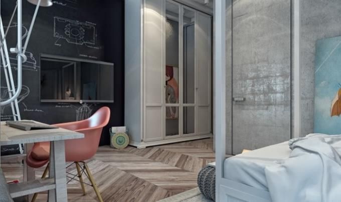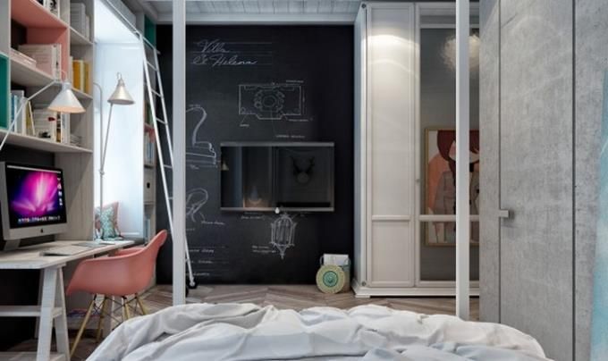 Bạn có thể chọn đồ nội thất màu trắng như thiết kế trên hoặc thay thế bằng đồ nội thất gỗ. Bằng cách thêm đồ nội thất từ gỗ, căn phòng sẽ trở nên sang trọng hơn và phù hợp hơn với người trẻ tuổi.