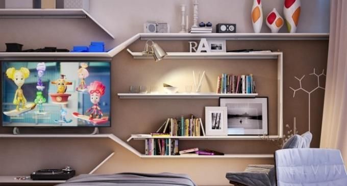 Kệ sách được thiết kế độc đáo làm điểm nhấn cho phòng.