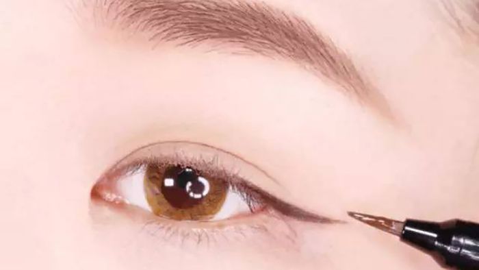 Bước 1: Sử dụng eyeliner, bắt đầu vẽ từ phía giữa mắt và kéo đều theo viền mắt để tạo ra phần kẻ eyeliner, nhưng chưa có phần đuôi.