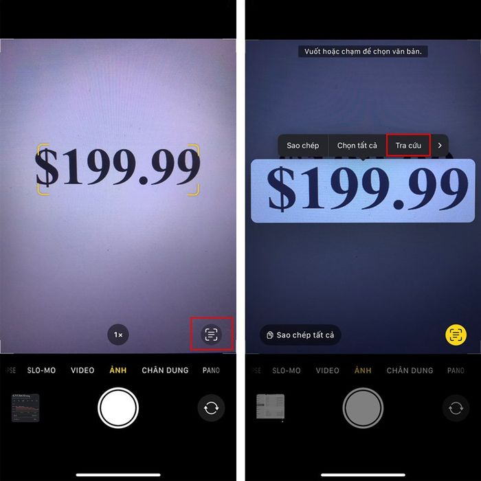 Bước 1: Mở ứng dụng camera trên iPhone > Di chuyển camera đến gần số tiền muốn chuyển đổi > Chạm vào biểu tượng Live Text > Chọn Tra cứu.