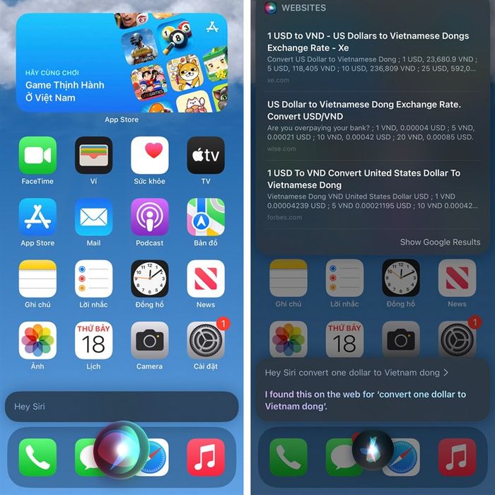 Cách nhanh hơn là sử dụng Siri để chuyển đổi tiền tệ. Ví dụ, bạn có thể dùng câu lệnh "Hey Siri, chuyển đổi 1 đô la thành đồng Việt Nam" để quy đổi 1 đô la sang tiền Việt.