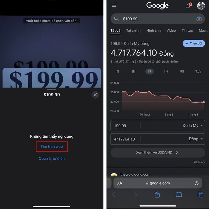 Bước 2: Hệ thống sẽ hiển thị bảng chọn ngay lập tức > Tích vào Tìm trên web > Nhận kết quả chuyển đổi tiền tệ ngay lập tức.