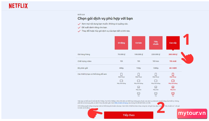Bước 3: Lựa chọn gói dịch vụ phù hợp (gói di động, cơ bản, tiêu chuẩn hoặc cao cấp) > nhấn “Tiếp theo”.