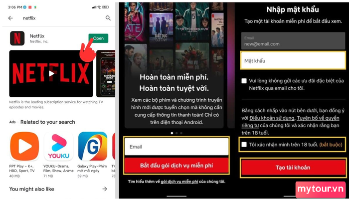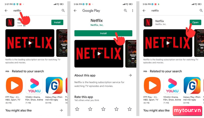 Bước 1: Mở ứng dụng Netflix trên điện thoại. Nếu chưa cài đặt, truy cập Google Play > tìm kiếm app > chọn “Cài đặt” để cài đặt app và nhấn “Mở” khi hoàn tất.