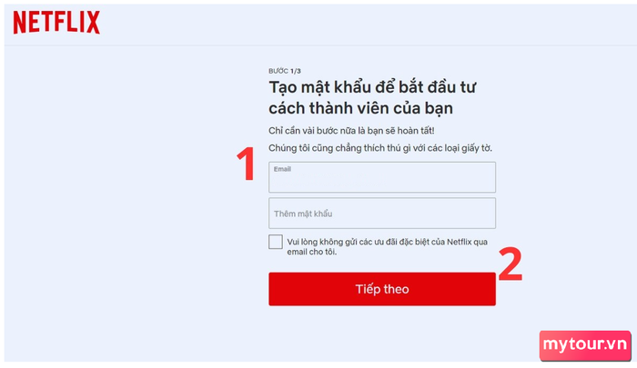 Bước 2: Nhập thông tin email và mật khẩu để đăng ký tài khoản > nhấn “Tiếp theo”.