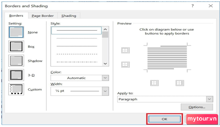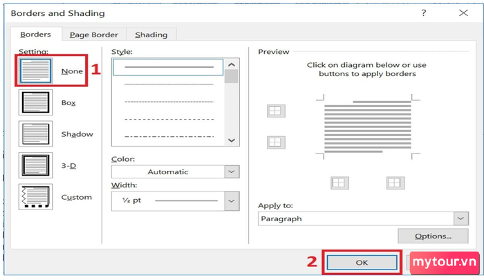 Bước 3:Trong hộp thoại Borders and Shading, chọn thẻ Borders. Ở phần Setting, chọn None và nhấn OK để hoàn tất quy trình.