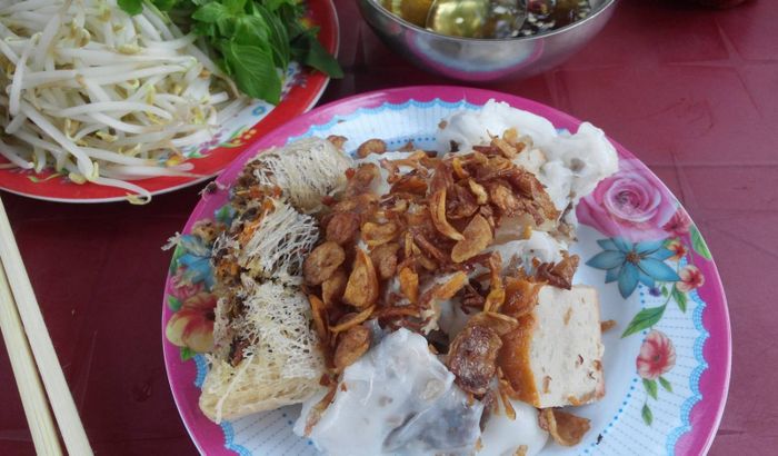 Mỗi phần bánh cuốn đi kèm với chả cắt viên to, thêm rau giá và hành hpi, tạo nên hương vị bắt vị độc đáo.